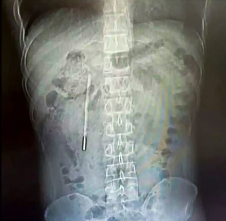 精密検査の結果、該当の物体は子供の頃に飲み込んだ水銀体温計であることが確認された。体温計は十二指腸の部分に引っかかったまま長期間留まっており、先端が腸壁に触れて穿孔や内出血につながる恐れのある危険な状態だったと伝えられた。