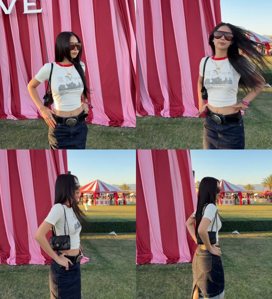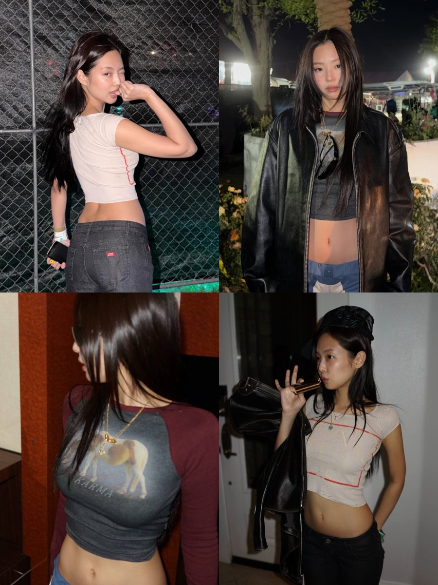 公開された写真を見ると、ジェニーはショート丈Tシャツにデニムのパンツを合わせたスタイリングで目を引く。