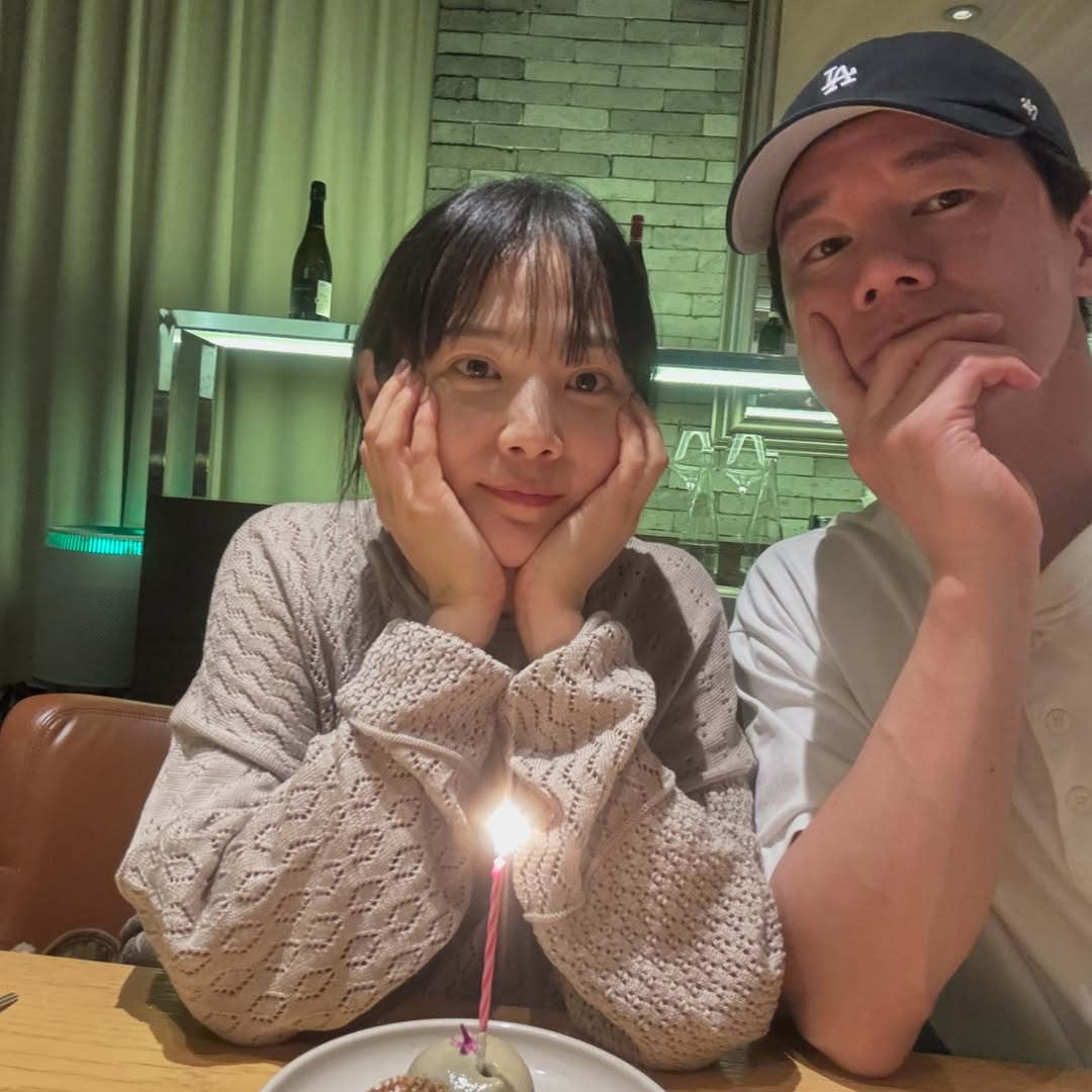 公開された写真を見ると、ユン・スンアは夫の俳優キム・ムヨルと何かを記念しているのか、ろうそくが刺さった一切れのケーキの前で仲良くポーズを取っている。これは、二人の結婚11周年を祝っているものとみられる。