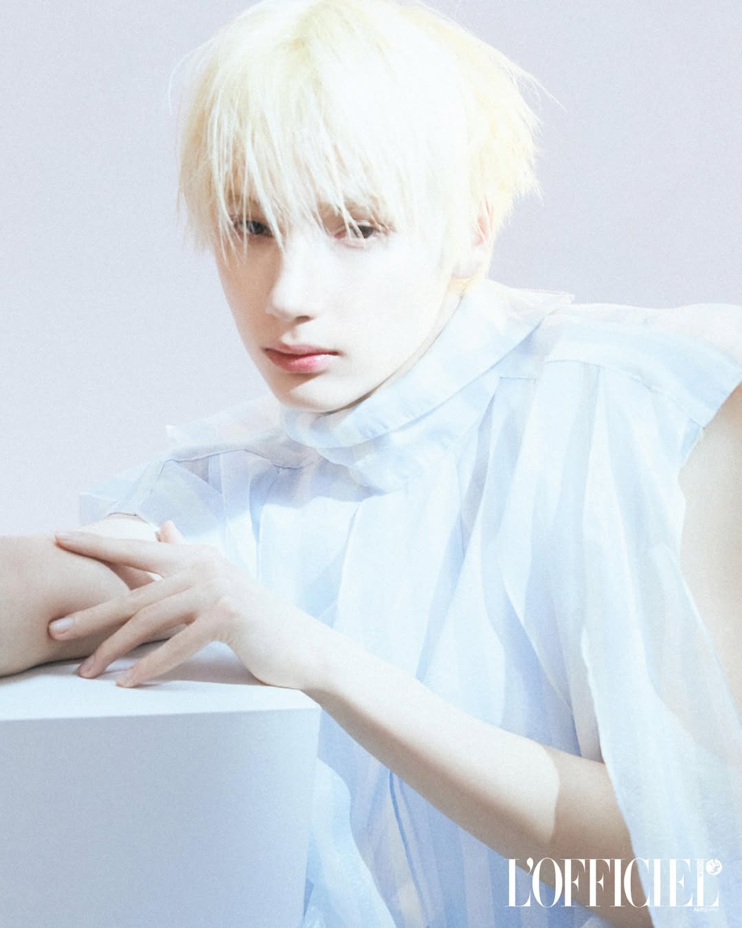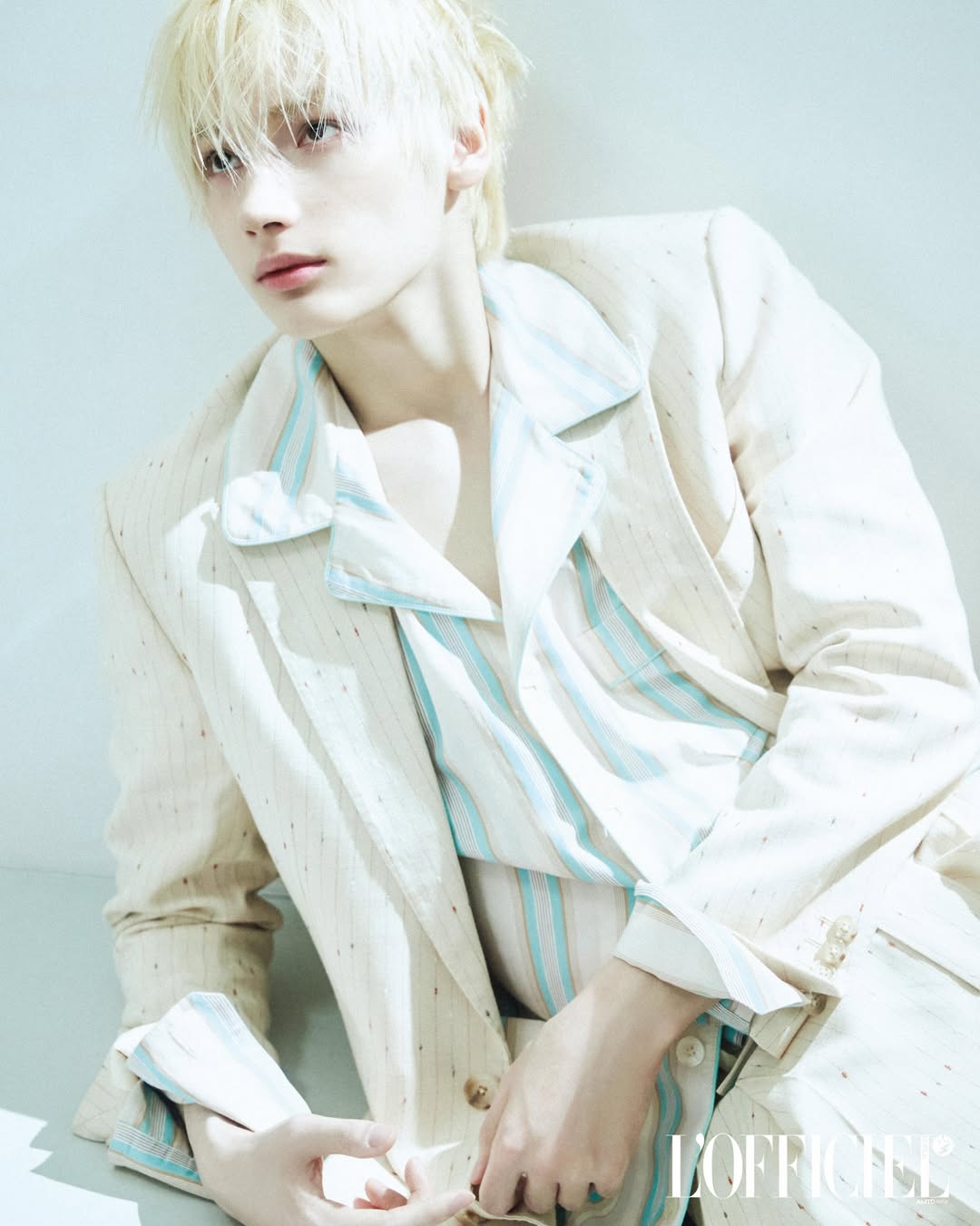ヨーロッパ的なルックスとプラチナブロンドがナチュラルにマッチし、幻想的でミステリアスな少年の美しさを感じさせる。ヒュニンカイは今シーズンのファッション・ハウスの新作アイテムを独自の感性で完璧に着こなしている。