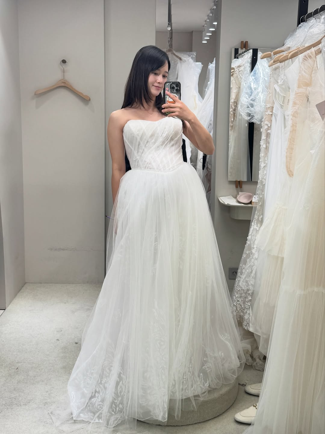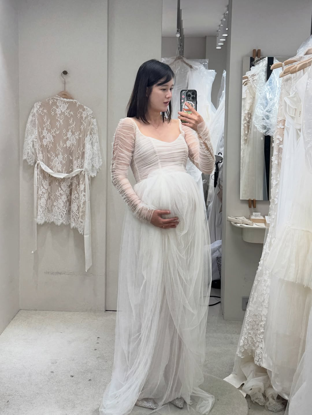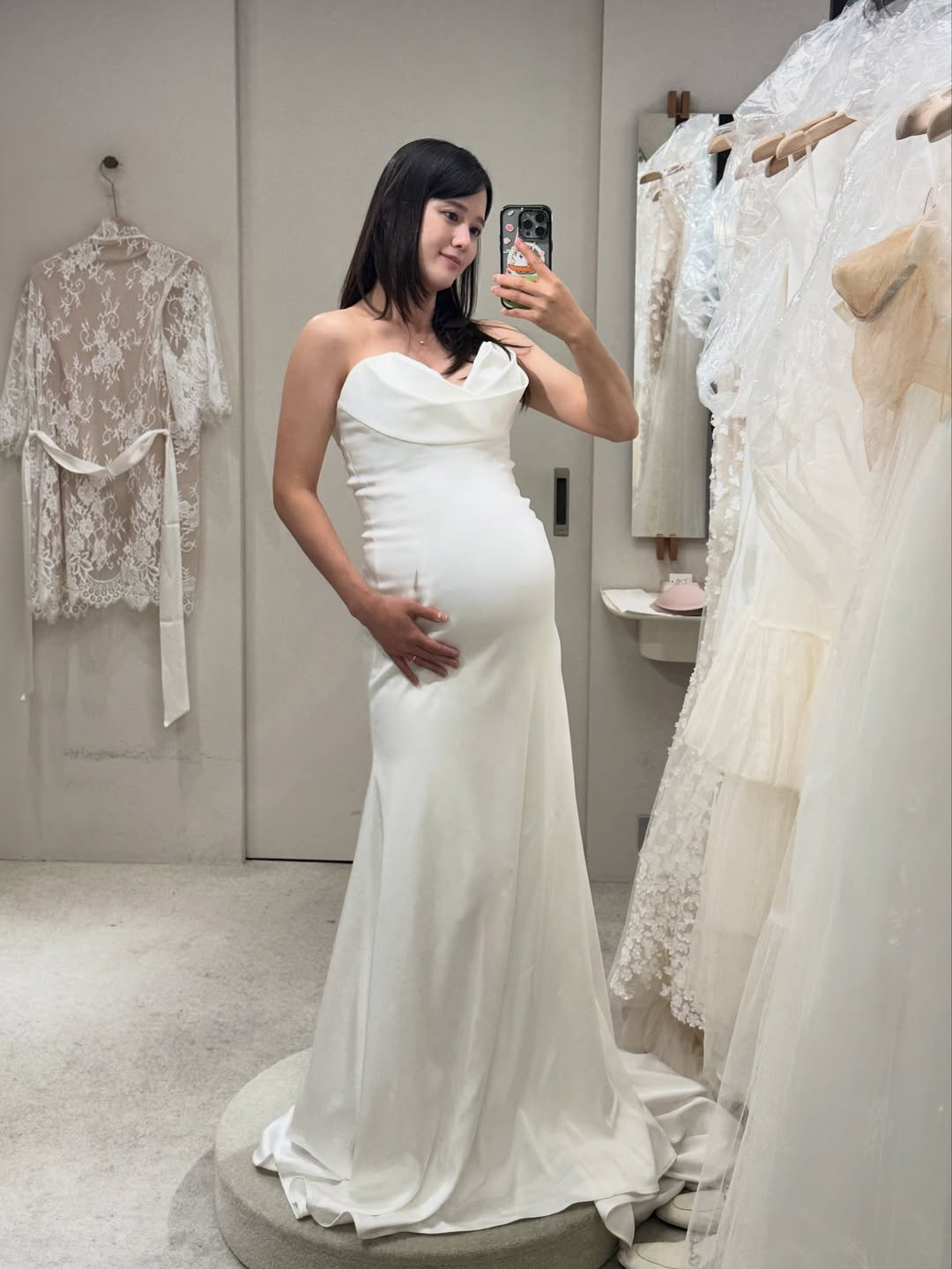 公開された写真のナム・ボラはウエディングドレス・ショップと思われる場所でさまざまな純白のドレスを試着し、鏡を使って自撮りしている。体にフィットするマーメイド・スタイルのドレスは美しいおなかのラインを一層際立たせ、ボリュームのあるシースルードレスはエレガント&キュートな印象だ。臨月なのにスッキリした腕のラインやハッキリした顔立ちも視線をさらっている。