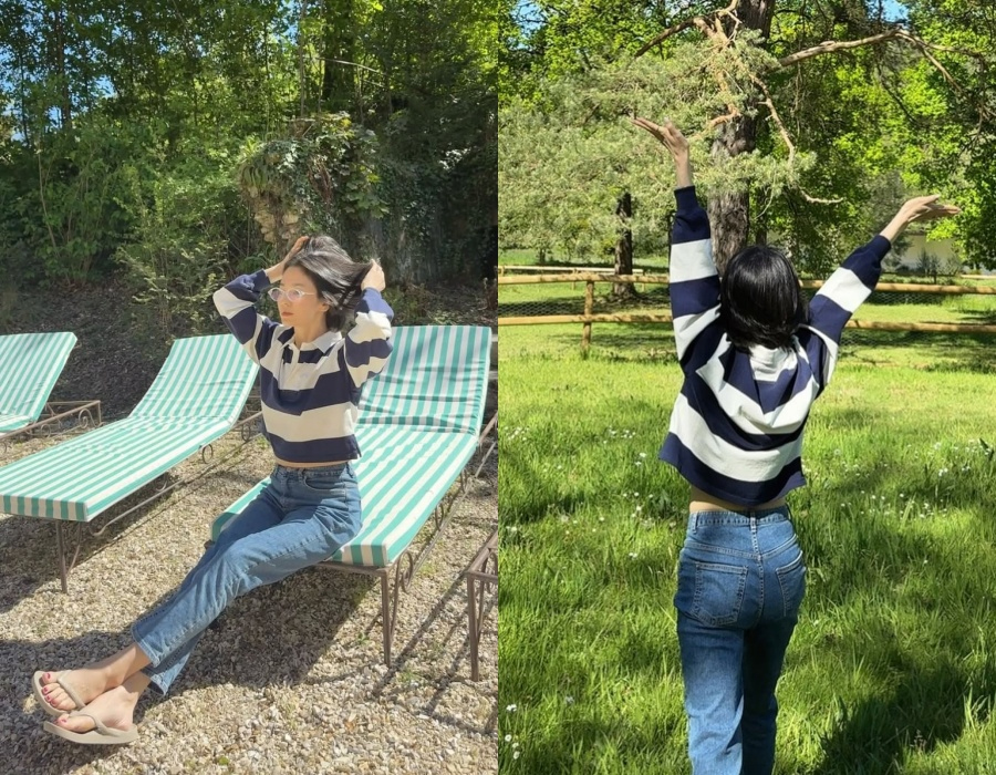 公開された写真を見ると、ソン・ヘギョは青々とした芝生や木々に囲まれた空間で、ボーダー柄のトップスにデニムのパンツを合わせたラフなコーデを披露しており、目を引く。