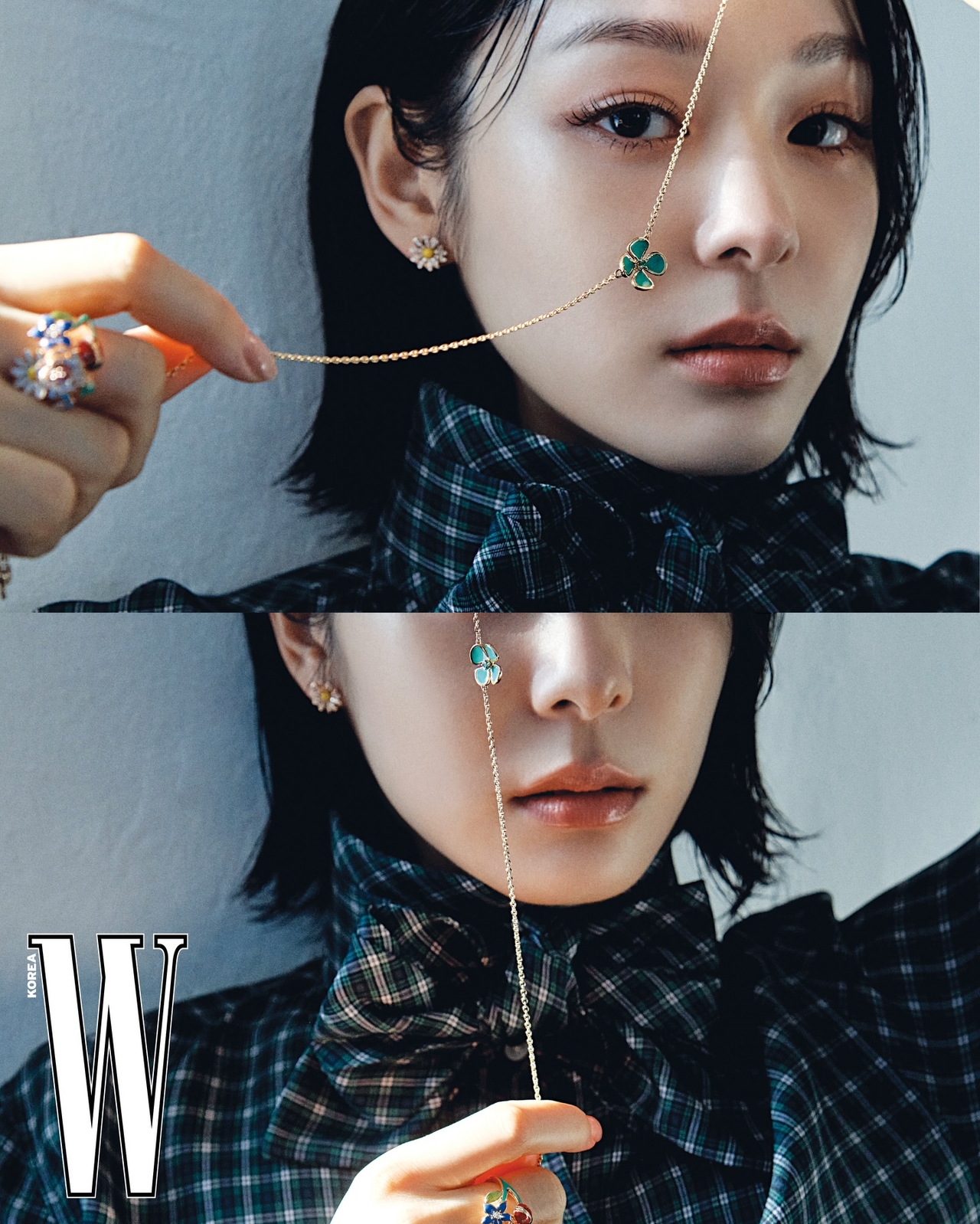 別の写真では、ジャケットにプリーツスカートを合わせたスタイリングからジュエリーを活用したクローズアップ・グラビアに至るまで多彩なコンセプトをこなし、人並みならぬオーラを漂わせている。