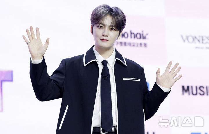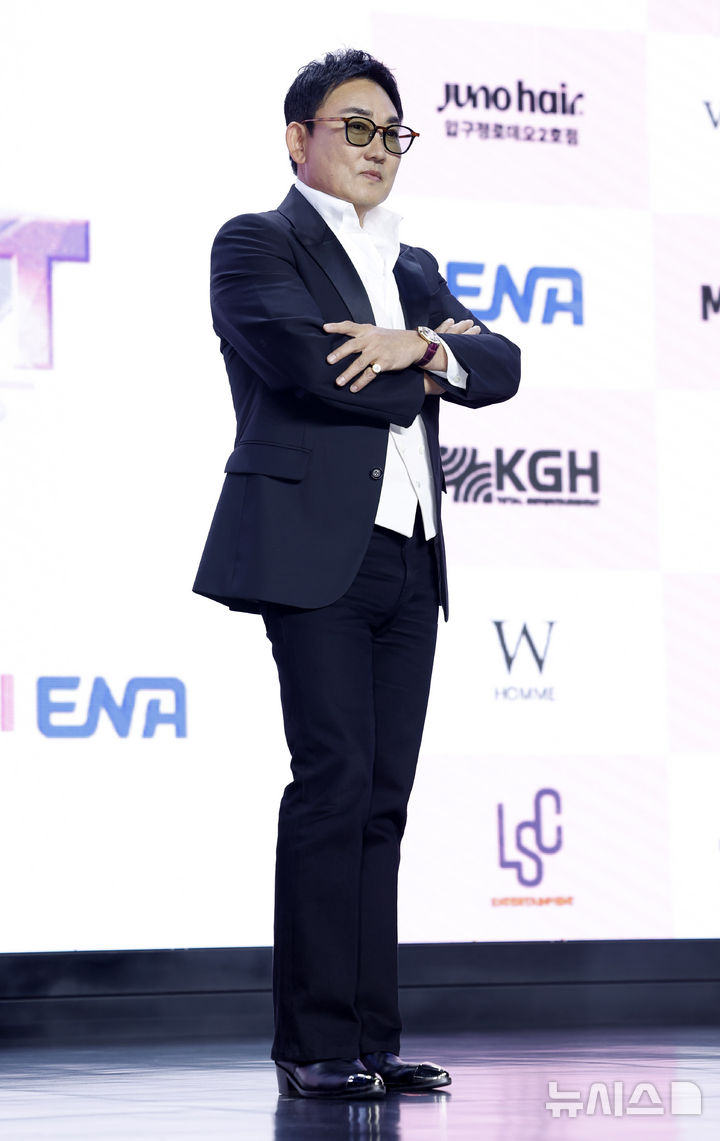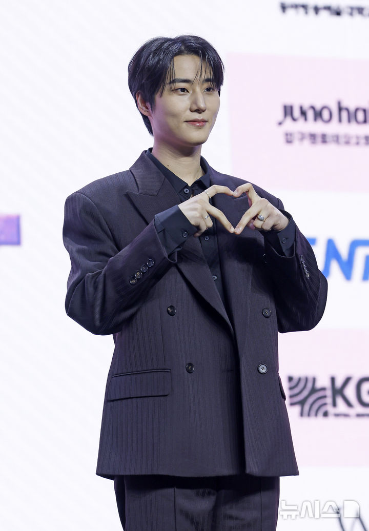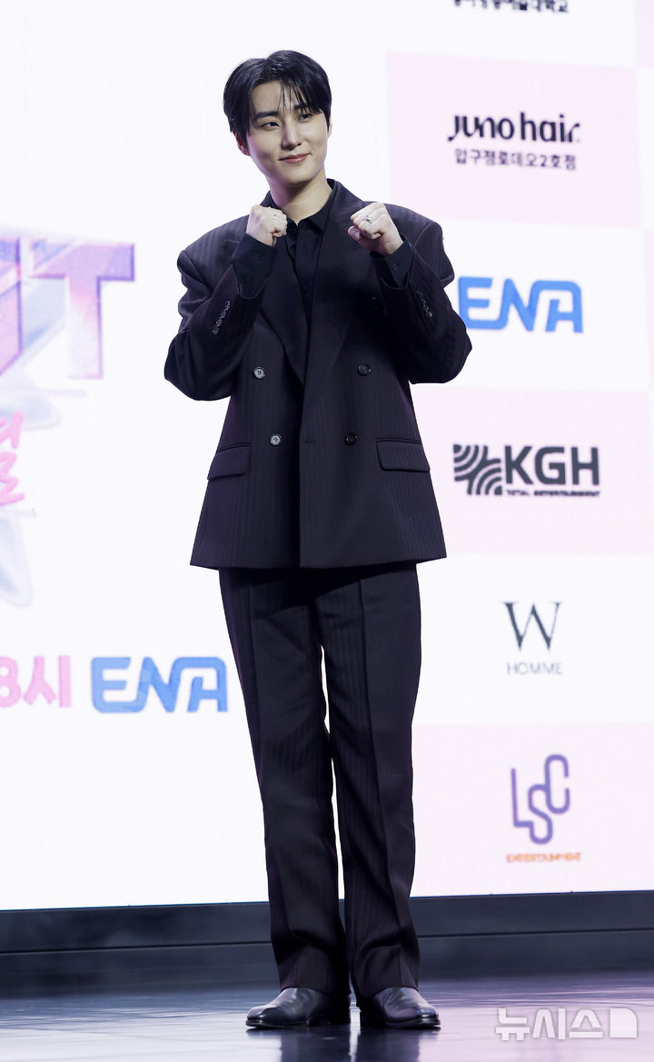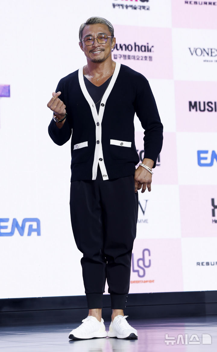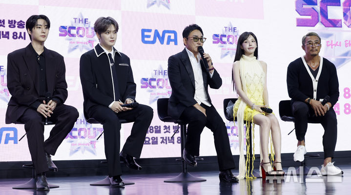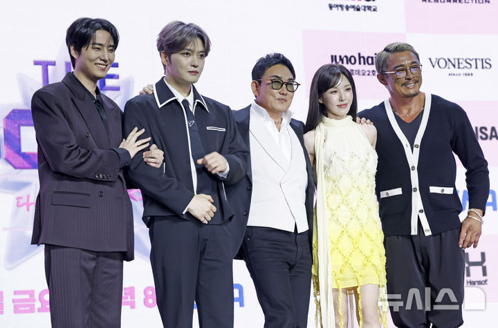 歌手Young K、キム・ジェジュン、イ・スンチョル、ウェンディ、総合格闘技選手でタレントの秋山成勲(韓国名:秋成勲〈チュ・ソンフン〉)=写真左から=が29日午前、ソウル市麻浦区のCubeコンベンションセンターで開かれた音楽番組『THE SCOUT:生まれ変わる星』(ENA)のメディアデー・イベントでポーズを取っている様子。