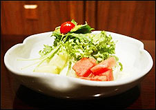 4.お皿にサラダを盛りつけ、ソースをかけて、できあがり。