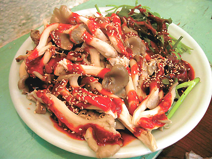 キノコの味をじっくり味わいたい人は、さっと茹でたヒラタケに酢コチュジャン(唐辛子ソース)を掛けたヒラタケ酢フェ(6000ウォン)がお薦め。
