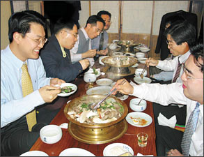 ▲南浦麺屋(ナムポミョンオク)=平安(ピョンアン)道の名物、オボクジェンバンと冷麺専門店。オボクジェンバンとは牛の胸部の肉と骨に松茸、春菊などを乗せたチョンゴル(寄せ鍋)。