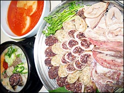 場所は水原商工会議所前。スンデ1万ウォン(2人前)、スンデスープ4000ウォン、鍋・炒め物1万2000ウォン。問い合わせ(031)256-2323。