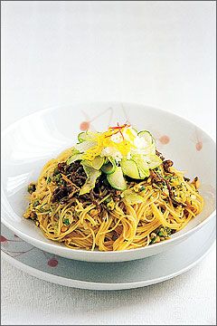 ▲材料:そうめん500グラム、キュウリ150グラム(水1カップ、塩大さじ1/2に漬けた後、ごま塩、ごま油、にんにくのみじん切りを混ぜる)、牛肉100グラム(しょう油大さじ1、砂糖大さじ1/2、ごま塩大さじ1/2、ごま油大さじ1、にんにくのみじん切り大さじ1/2、胡椒少々)、生しいたけ100グラム(しょう油小さじ2、にんにくのみじん切り小さじ1、砂糖小さじ1、ごま油大さじ1、ごま塩大さじ1/2、胡椒少々)、梨1/2個、卵2個、食用油少々、塩少々、松の実大さじ1、たれ(ネギの細切り1カップ、にんにくのみじん切り大さじ2、しょう油大さじ5、砂糖大さじ2、ごま油大さじ2、ごま塩大さじ2、マッシュルームの細切り1/2カップ、キュウリのみじん切り1カップ、唐辛子油大さじ2)