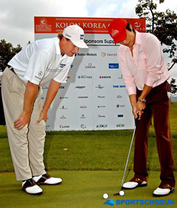 韓流スターの李炳憲(イ・ビョンホン/34)とゴルフ界のスーパースター、アーニー・エルス(35)がグリーンで対面した。 李炳憲は8日、天安(チョナン)ウジョンヒルズCCで行われた第47回コーロン韓国オープン、プロ・アマ大会に参加してアーニー・エルスと会った。 時計メーカー「オメガ」のスポークス・パーソンを務める李炳憲とアーニー・エルスは、大会開始前に対面して互いの健闘を称え合った。 李炳憲はアーニー・エルスからサインボールをもらい、その場でパッティングのレッスンも受けた。