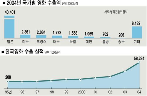 作品の単価も上がり、昨年1作品あたりの平均輸出額は30万436ドル(約3億900万ウォン)で2003年の18万8896ドルに比べ、67%以上増えた。昨年輸出された韓国映画は計194本で、2003年の164本に比べて約32本が増えた。