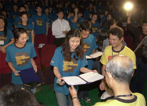 25日午後、光州(クァンジュ)国際映画祭をひかえ、広報大使を務める女優のパク・ソルミがボランティア宣誓に参加し、広報冊子を配るなど、忙しく動き回っている(写真=NEWSIS)。