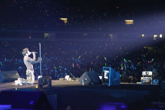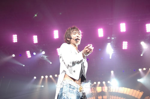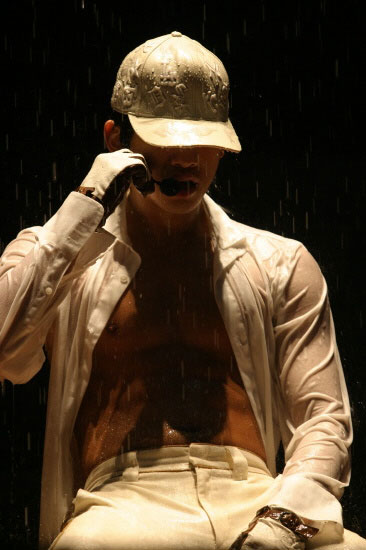 ピは22日午後7時30分、中国北京で13回目の定期公演(Rainy Day)を行った。同公演は中国公安当局発表で3万8000人余の観客を集めた。雷の音が公演会場を包むなか、リフトに乗って舞台に登場したピは、「悪い男」などヒット曲を激しいダンスと共に観客に披露した(写真:JYPエンターテイメント)。