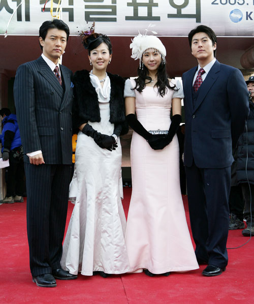 22日、慶尚南道陜川郡のオープンセットで行われたKBS第1テレビ大河ドラマ『ソウル1945』(脚本:イ・ハノ、チョン・ソンヒ、演出:ユン・チャンボム、ユ・ヒョンギ)の制作発表会でドラマ衣装の披露会が行われ、主演俳優たちがポーズを取っている(写真=NEWSIS)。