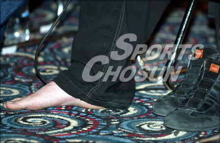 懇談会の途中、テーブルの下にひょっこり現れた裸足