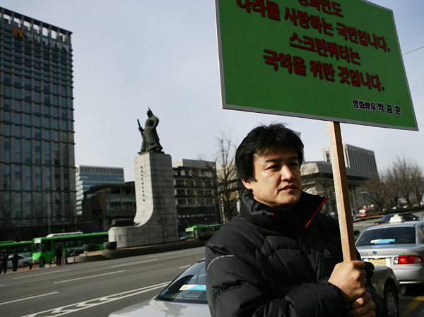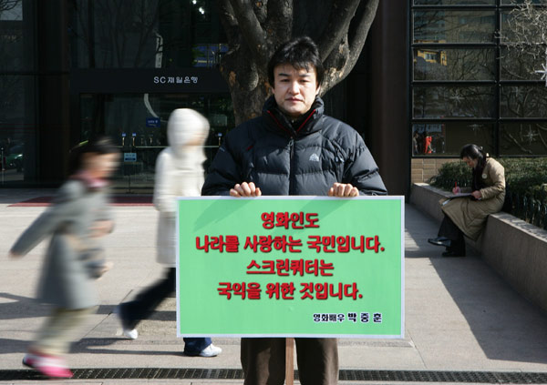 5日午後、ソウル光化門教保ビルディング前で、俳優のパク・ジュンフンが「スクリーンクオーター死守1人デモ」を行っている(写真=NEWSIS)。