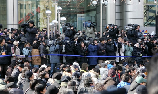 8日午後2時、ソウル光化門の東和免税店前で行われた「文化侵略阻止およびスクリーンクオーター死守のための映画人大会」で、映画俳優、監督、制作会社、大学生など3000人余が沈痛な表情で座り、壇上を見ている。