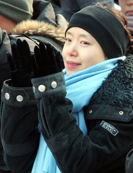 8日午後2時、ソウル光化門の東和免税店前で行われた「文化侵略阻止およびスクリーンクオーター死守のための映画人大会」で、女優のチョン・ドヨンが拍手をしながらすくリークオーター死守を叫んでいる(写真=NEWSIS)。