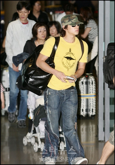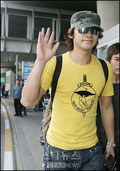 歌手Rain(ピ)がニューヨークで9日午後1時30分(現地時間)、大韓航空082便に搭乗し、10日午後5時に仁川空港に到着し、取材陣に手を振っている。