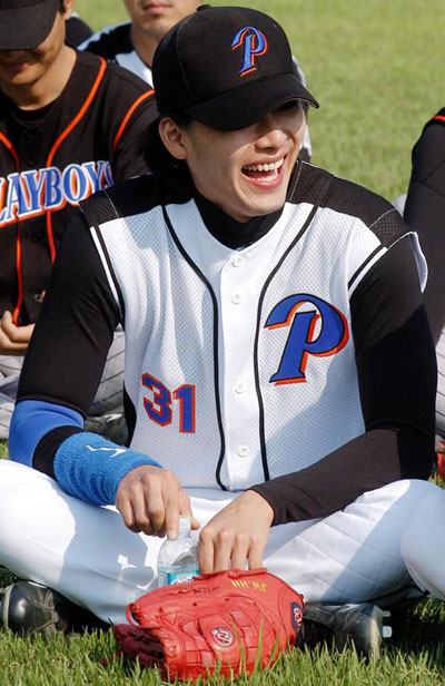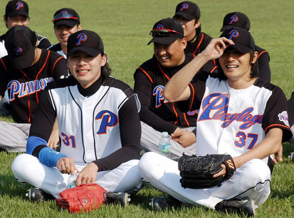 14日「プレーボーイズ」のチーム青白戦が李鍾範球場で行われ、試合終了後のインタビューでヒョンビンが明るい笑顔を見せている(写真=NEWSIS)。
