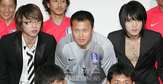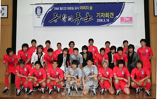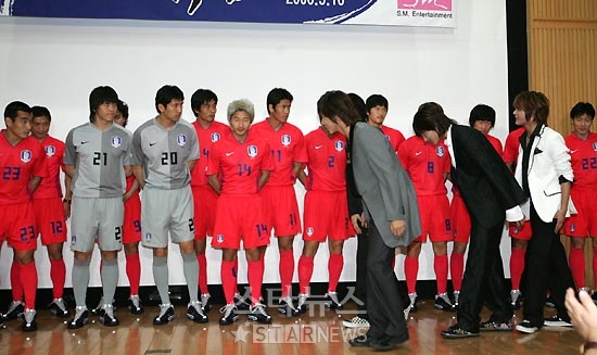16日午後1時、京畿道坡州の韓国サッカー代表チームトレーニングセンター(NFC)で行われた「2006ワールドカップ公式イメージソング-東方の闘魂」発表記者会見で、東方神起のメンバーとサッカー代表チームがあいさつをしている。