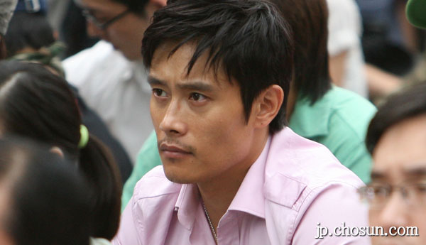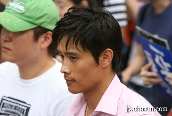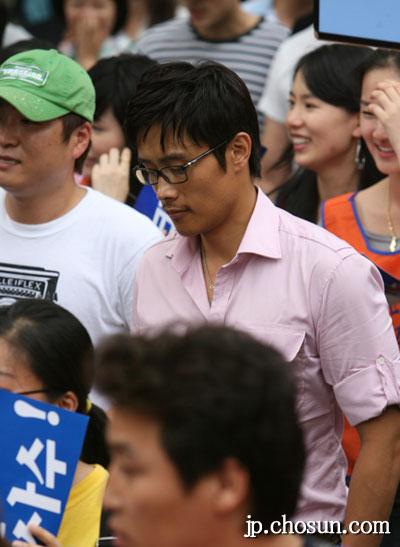 1日、韓米FTA阻止とスクリーンクォーター縮小反対のための大規模な集会・文化祭「参与政府には国民はない」がソウル大学路と光化門一帯で行われた。集会に参加したイ・ビョンホンが心配そうな表情で見つめている。