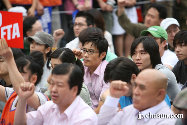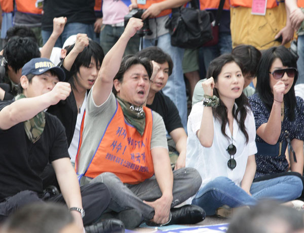 1日、ソウル大学路で行われた「スクリーンクォーター死守およびFTA決議大会」で映画人らがスローガンを叫んでいる(写真=聯合ニュース)。