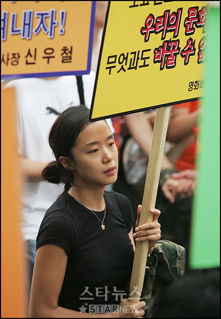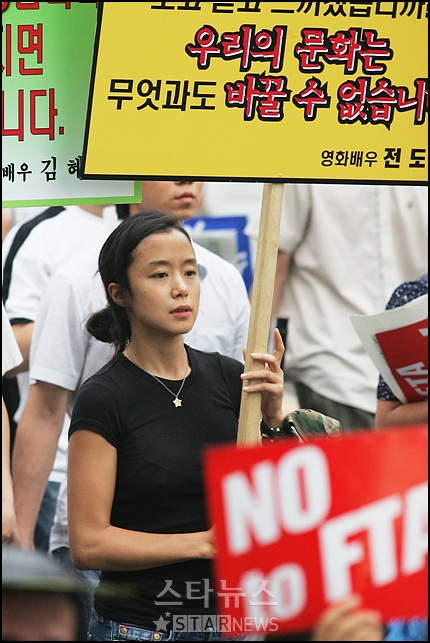 女優のチョン・ドヨンが1日午後、スクリーンクォーター復帰と韓米FTA阻止のための集会・文化祭「参与政府に国民はない」に参加し、2時間余りに渡りピケットを持って大学路から光化門まで行進している。