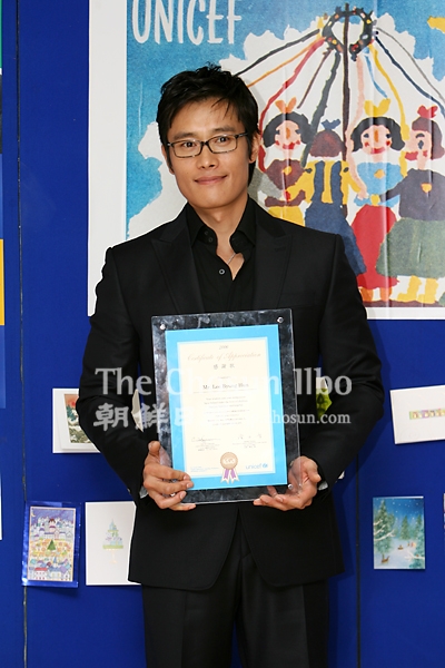 23日午後、ソウル鍾路のユニセフ韓国委員会で開かれた「ユニセフ日本委員会感謝牌および『イ・ビョンホン-あなたに逢えて良かった-』書籍販売収益金贈呈行事」で、感謝牌授与後、イ・ビョンホンがポーズをとっている。