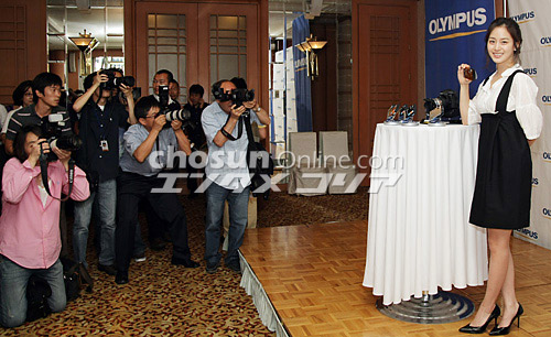 28日午前10時30分、ソウル小公洞のウェスティン朝鮮ホテルで行われたオリンパス・コリアのデジタルカメラ新製品発表会で、専属モデルのキム・テヒがカメラを手に写真撮影をしている。