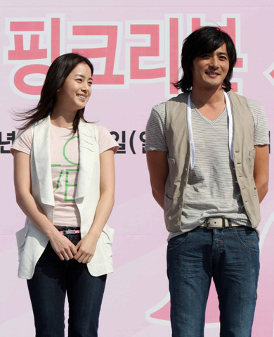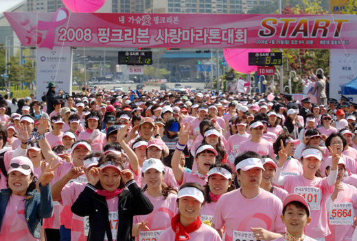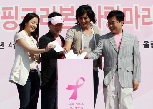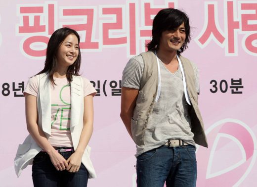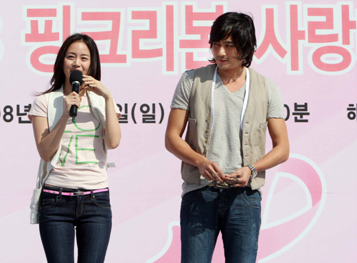釜山・海雲台のオリンピック公園で20日午前、「2008ピンクリボン愛のマラソン大会」が行われ、広報大使を務めるチャン・ドンゴンとキム・テヒがあいさつをしている。 同大会は乳がん予防キャンペーンの一環として開催されたもので、釜山大会を皮切りに5月には大田、6月に光州、9月に大邱、10月にはソウルで行われる。