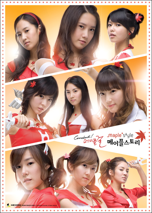 アイドルグループ「少女時代」がメイプルガールに変身した。 オンラインゲーム会社「NEXON」は最近、少女時代が自社の人気オンラインゲーム「メイプルストーリー」のメイプルガールに変身したポスターを公開した。NEXONは「少女時代」の直筆のサインがホログラム処理された限定版ブロマイドのプレゼントイベントも展開する予定だ。 現在、ゲーム専門ケーブルテレビで『カムバック! メイプル』というコンセプトのCMが放送されており、CM制作の過程を収録したメイキングフィルムも公開する予定だ。