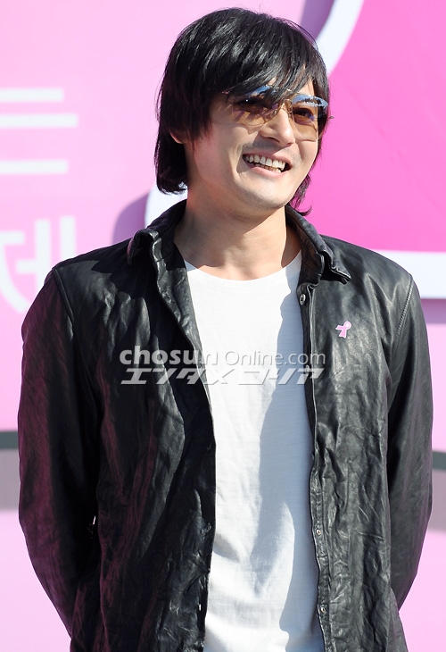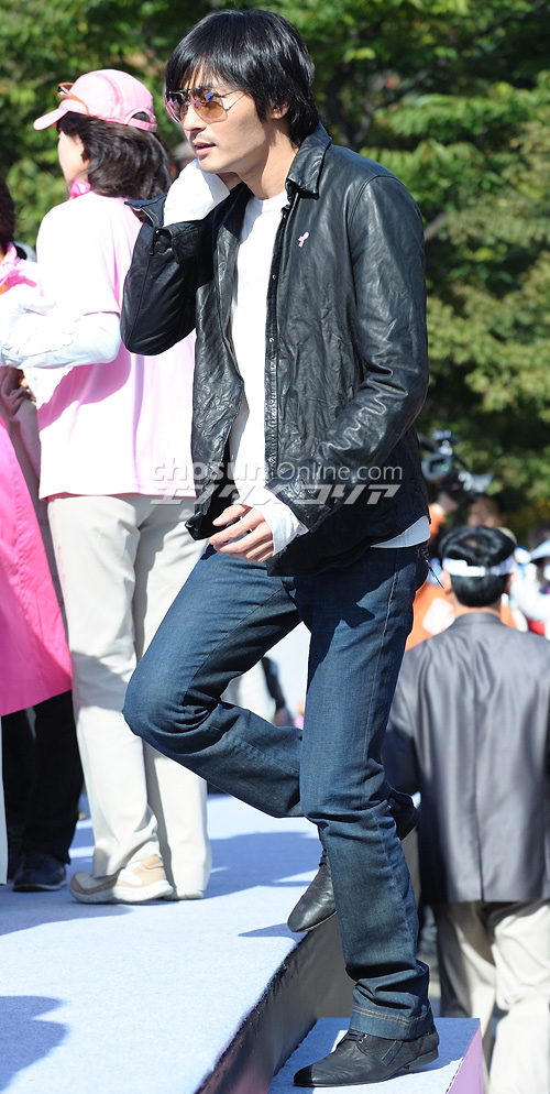 12日午前、ソウル・ワールドカップ・スタジアム近くにある平和の公園で、乳がん予防を呼びかける「2008ピンクリボン愛のマラソン ソウル大会」のイベントが開催された。 写真は久しぶりに姿を見せたチャン・ドンゴン。化粧品メーカー「アモーレ太平洋」のイメージキャラクターとして、寄付金を手渡した。