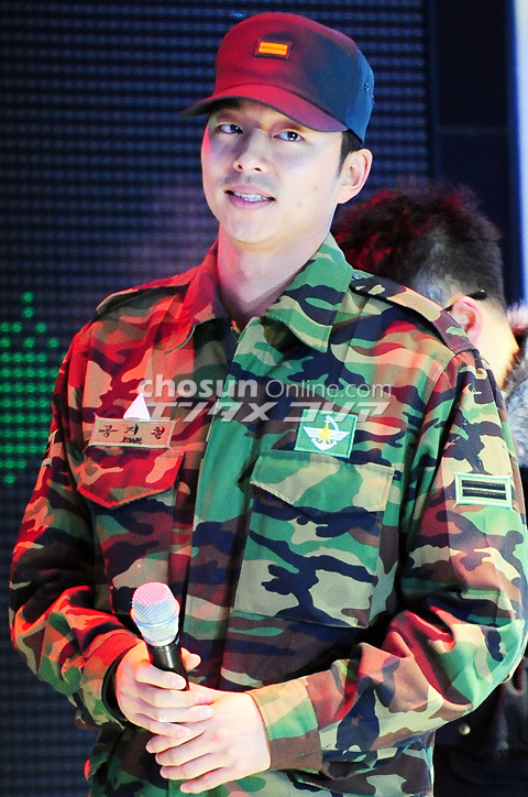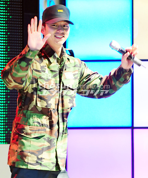 5日午後、大型ショッピングセンター「グッドモーニング・シティー」(ソウル市東大門区)特設ステージで「国軍放送FMラジオ南山送信所完工特集公開放送」が行われた。写真は入隊以来初めて公の場に姿を見せたコン・ユ。笑顔でステージに登場した。