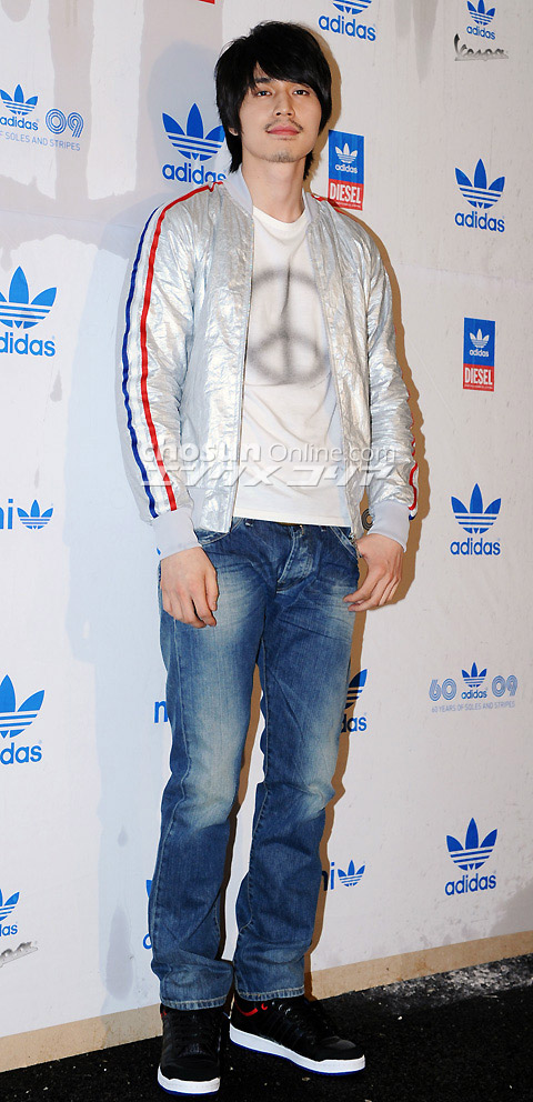 5日夜、イベント会場「クンストハレ」(ソウル市江南区)で、アディダスのストライプロゴ誕生60周年を記念する「HOUSE PARTY KICK OFF」が行われた。写真はスリーストライプのジャケットを着たイ・ドンウク。