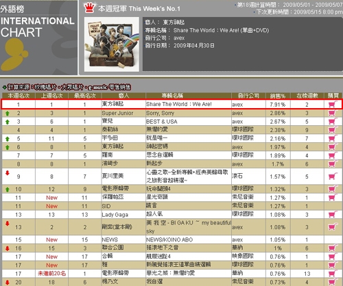 今月1日-7日まで集計された、台湾のアルバムセールス集計サイト「G-MUSIC風雲榜」のインターナショナルチャートで、東方神起の日本での27枚目のシングル「Share the world/ウィーアー!」が1位に輝いた。同曲は、4月24日-30日まで集計された同チャートでも1位となり、2週連続で1位を獲得した。