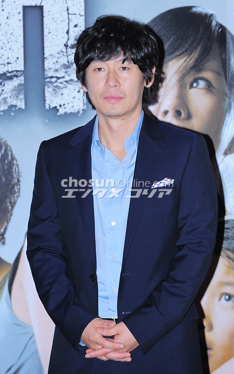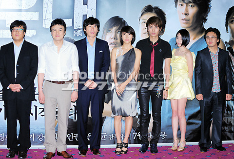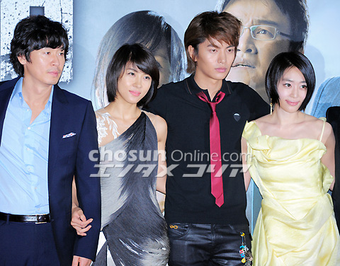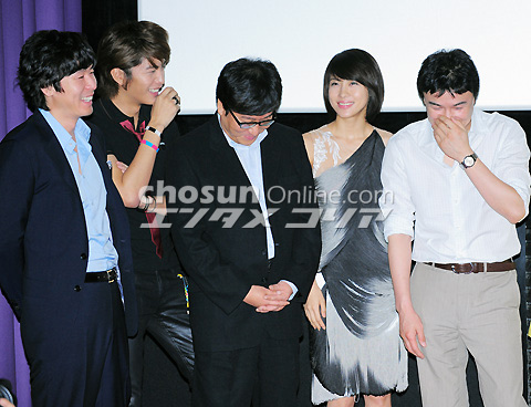16日午後2時、ソウル市内の映画館「竜山CGV」で、大作パニック映画『海雲台』の記者試写会・懇談会が行われた。写真は記念撮影するユン・ジェギュン監督、出演者のソル・ギョング、ハ・ジウォン、イ・ミンギ、カン・イェウォン。