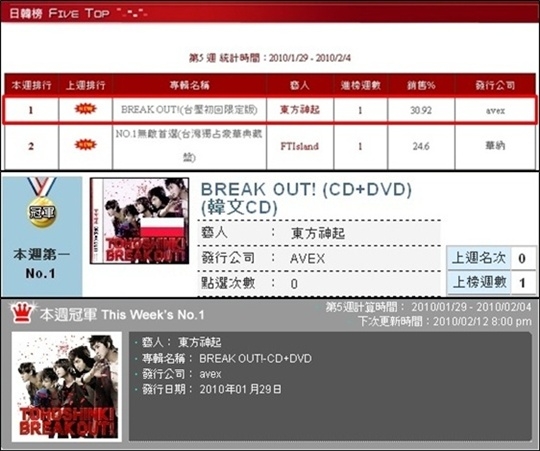 7日現在、台湾のCD販売集計サイト「G‐ミュージック・アジアチャート」と「ファイブ・ミュージック・韓日チャート」の1月29日-2月4日までの週間チャートで、1月27日に日本でリリースされた東方神起の「BREAK OUT!」が堂々の1位を獲得。