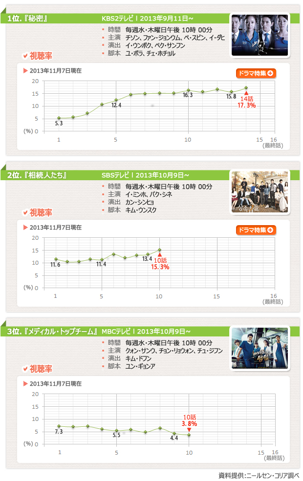 水木ドラマ『秘密』(KBS第2)が自己最高視聴率をマークした。 7日に放送された『秘密』の視聴率は前日放送分(15.8%)に比べ1.5ポイント増の17.3%(7日、ニールセン・コリア調べ、以下同じ)。これは自己最高視聴率で、同時間帯に放送されたドラマで1位。 なお、『王冠をかぶろうとする者、その重さに耐えよ-相続人たち』(SBS)は前日放送分(13.4%)に比べ1.9ポイント増の15.3%、『メディカル・トップチーム』(MBC)は前日放送分(4.4%)に比べ0.6ポイント減の3.8%。
