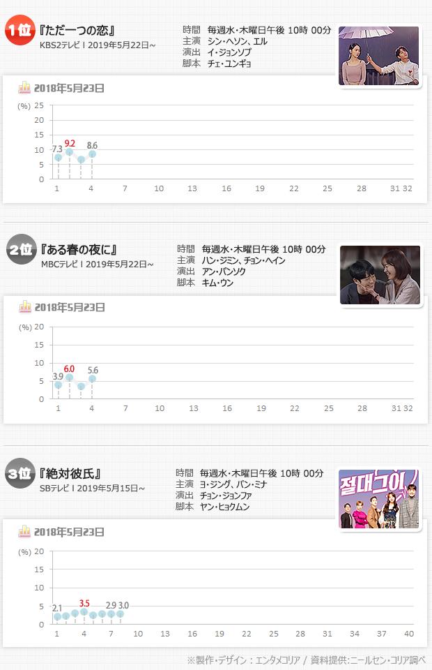 『ただ一つの恋』と同じ夜10時台に放送された『絶対彼氏』(SBS)は第7話が2.9%、第8話が3.0%だった。