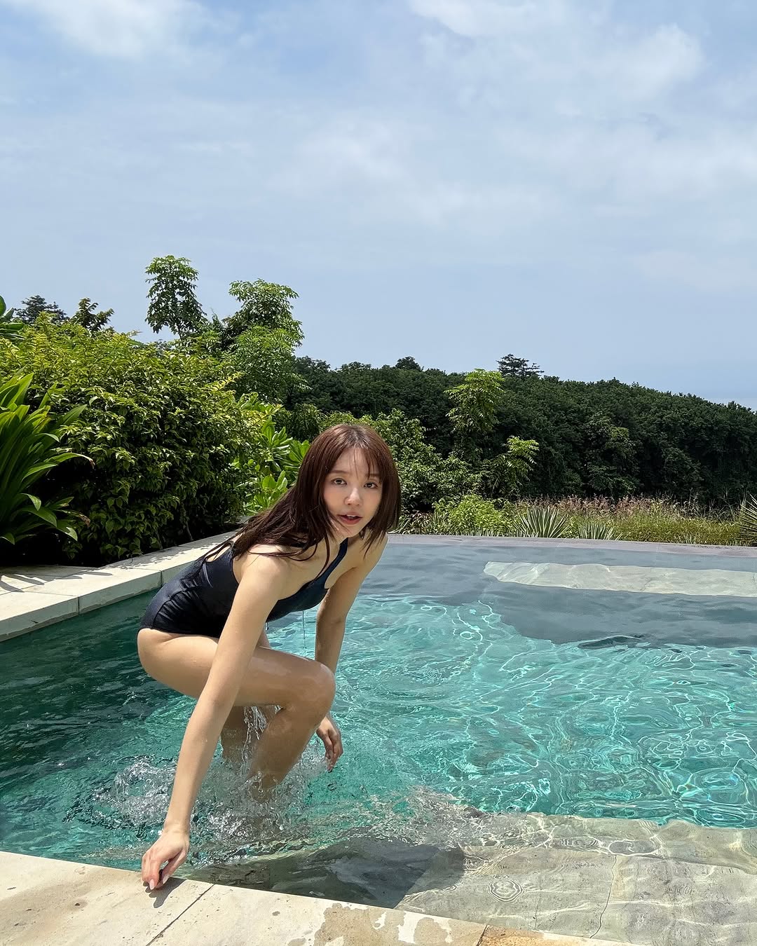 写真のユン・ウネはワンショルダーがポイントの水着を着て、美しいボディラインを披露している。ワンショルダーでボリューム感が際立ち、目を引く。