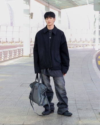 ジュヨンはこの日、ヘビーコットン素材を用いた同ブランドの黒いジップアップジャケットにローライズのデニムを合わせ、シックでスタイリッシュなフライトコーデを披露した。