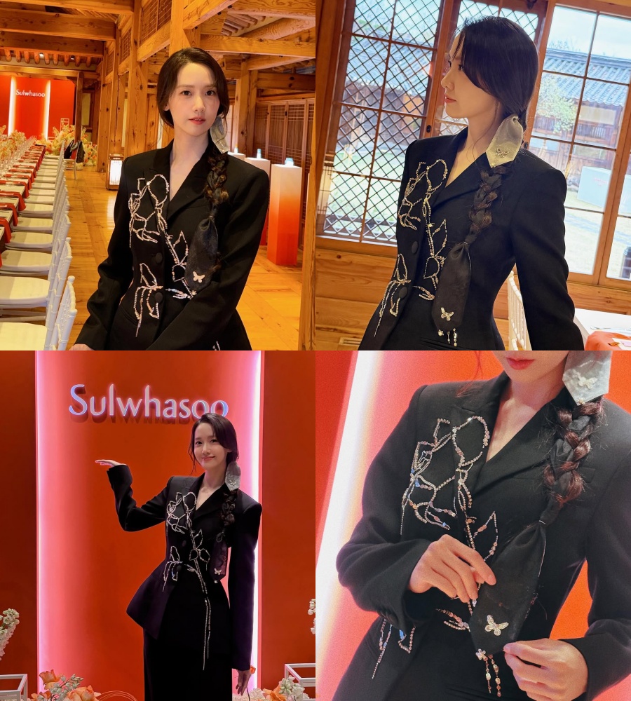 最近雪花秀のグローバル・アンバサダーに選ばれたユナは、美しいビーズの刺繍が施された黒いスーツを着て、美しく編んだ長い髪をデンギ(韓国伝統の髪飾り)で飾り、上品で優雅な雰囲気を漂わせていた。古風な韓屋(韓国の伝統家屋)と調和をなし、ユナの美しさを一段と際立たせている。
