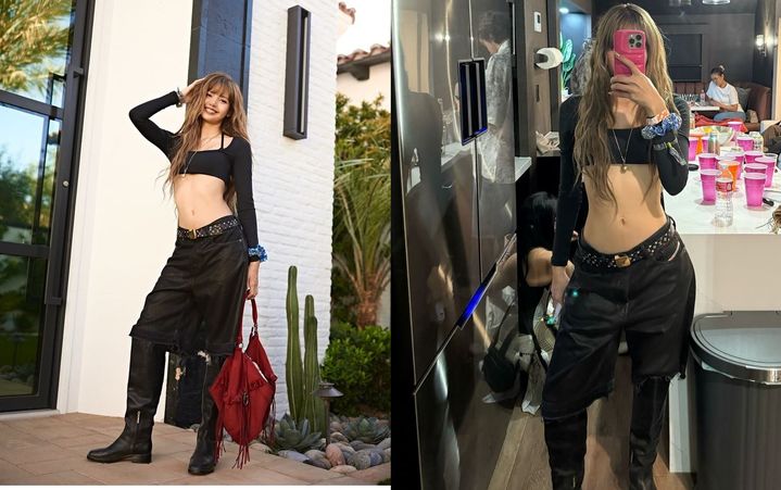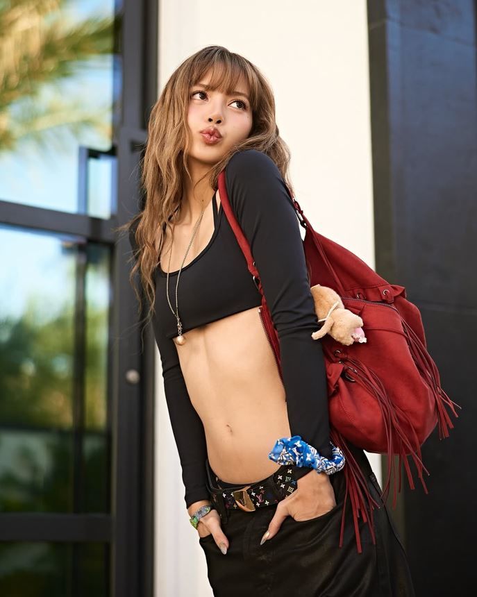 写真のリサは、黒の超ミニクロップドトップスにサルエルパンツを合わせ、ポーズしている。 くびれたウエストのラインが大胆なほどにあらわになっていて、リサのスタイルの良さがハッキリ分かる。さらに、ロングウェーブヘアと赤いバッグで、グローバル・スターにふさわしいスタイリッシュなファッションをアピールしている。