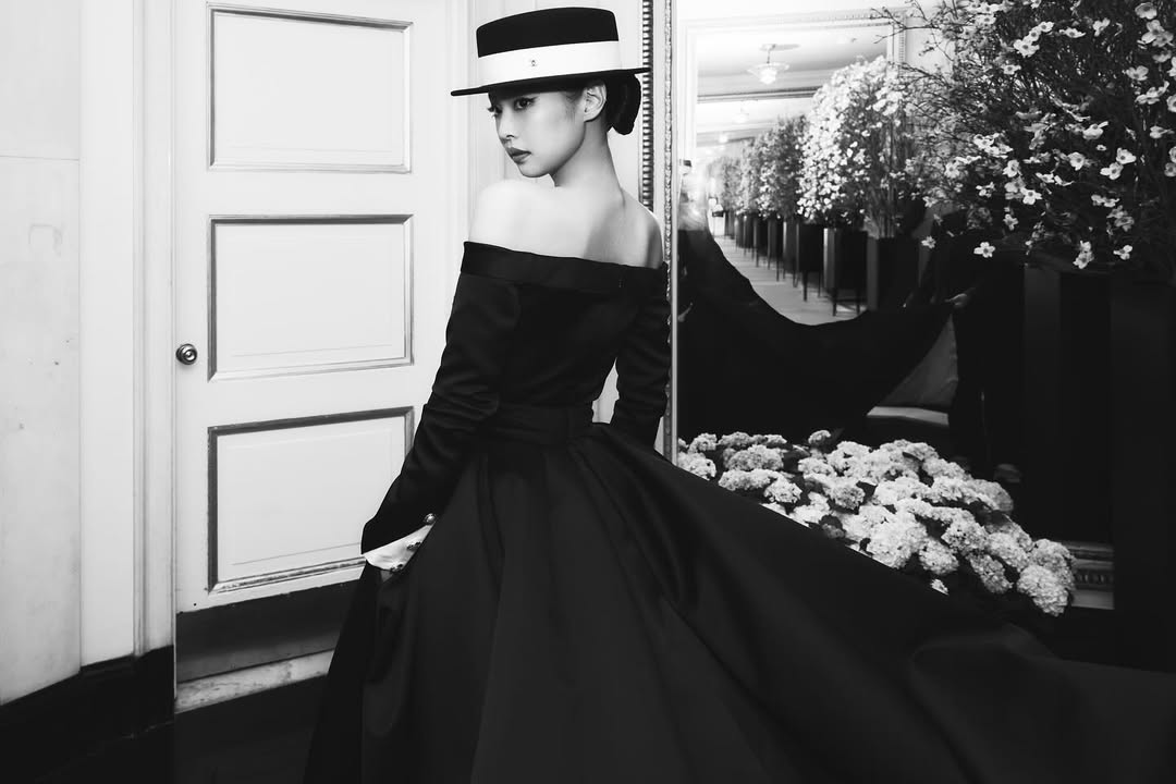 ジェニーは「Superfine:Tailoring Black Style(華麗なるブラック・スタイル)」というドレスコードにふさわしく、シャネルの黒のオフショルダー・トップスにパンツを合わせ、ハットでコーディネートを仕上げている。