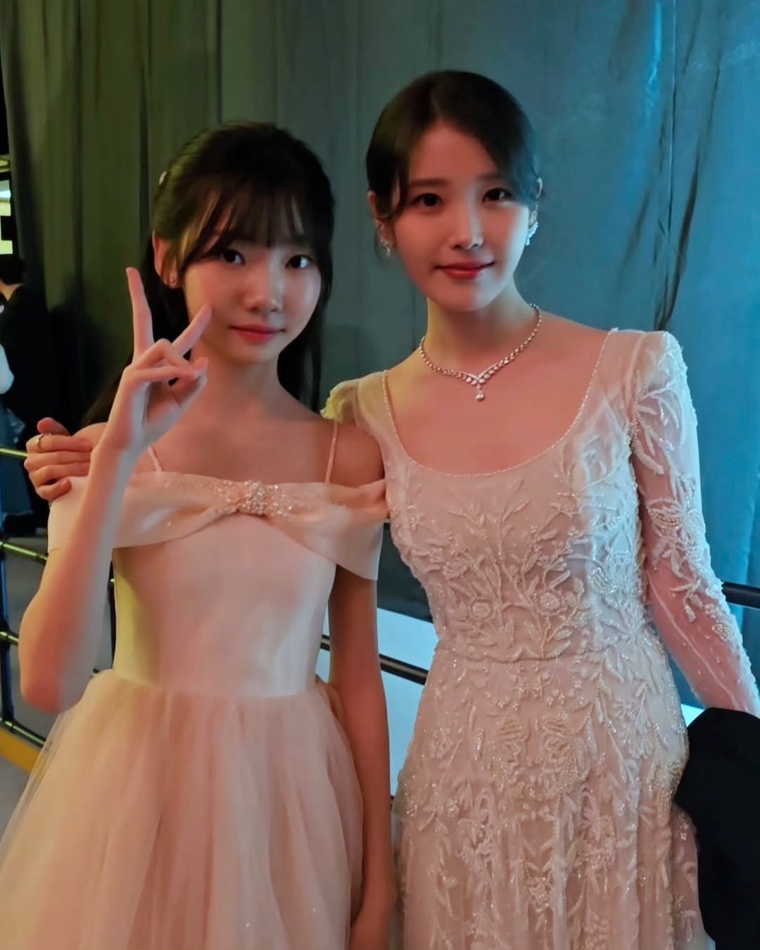 公開された写真には、第61回百想芸術大賞に出席したIUとキム・テヨンが写っている。2人は華やかなドレスを着て、仲良くポーズしている。