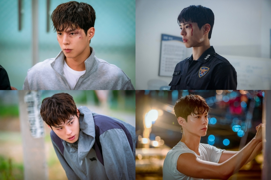 公開された写真でパク・ボゴムは、くっきりしたあざと血の跡が残る顔で正面を見つめていたり、深呼吸したりしている。ぎゅっと閉じた口と集中している眼差し、全身にみなぎる緊張感は、ユン・ドンジュというキャラクターが「体が先に動いて世の中とぶつかっていく」という生き方を示している。