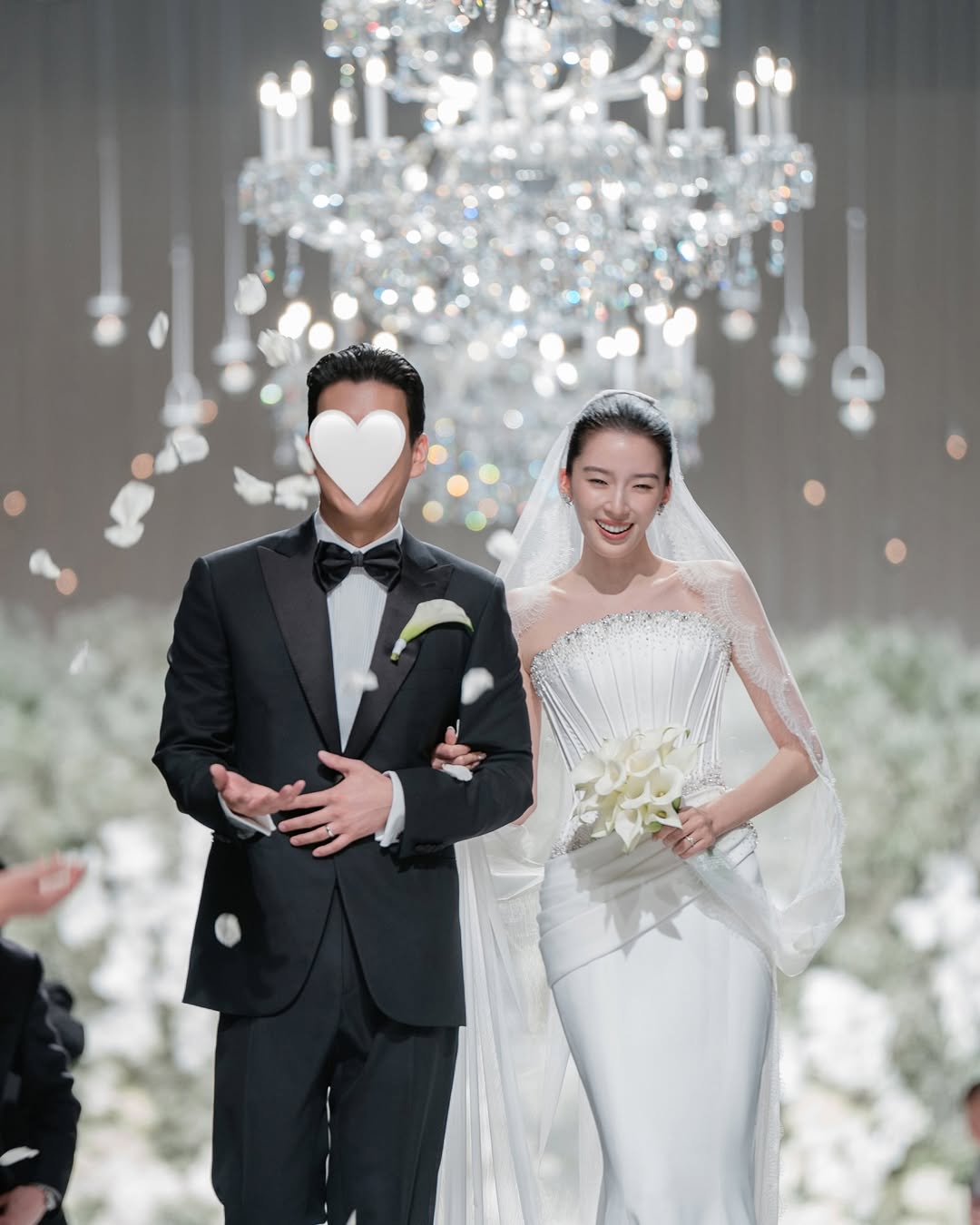 このたび公開された写真を見ると、アイリーンはモデルらしいスレンダーボディを誇っており、ドレスを完ぺきに着こなし、感嘆の声が上がっている。また、ハートのスタンプで顔が隠れているが、男らしい雰囲気漂う新郎の姿も目を引く。