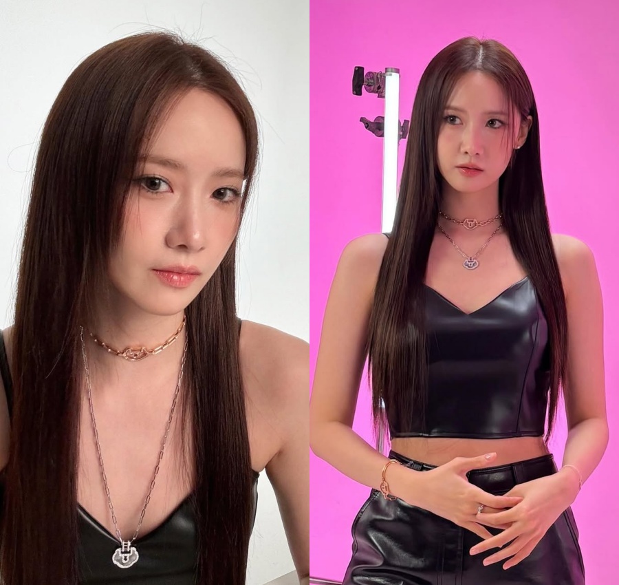 ユナは、黒いレザーのショート丈トップスにパンツを合わせた黒一色のコーデで登場。ムダのないボディラインとすべすべのデコルテラインを見せつけた。ロングヘアとミニマルなアクセサリーが、ユナ特有の洗練されていて都会的な雰囲気を際立たせている。