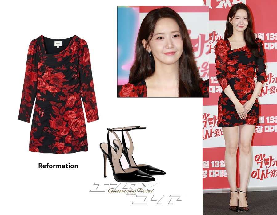 このワンピースは米国発のファッションブランド「Reformation」のアイテムで、価格はおよそ50万ウォン(約5万3400円)。黒地に鮮やかな赤の花柄が映える細身のミニワンピースはユナのスリムなシルエットを強調し、ネックラインやウエストラインのデザインが特徴的で、洗練されたムードを際立たせていた。